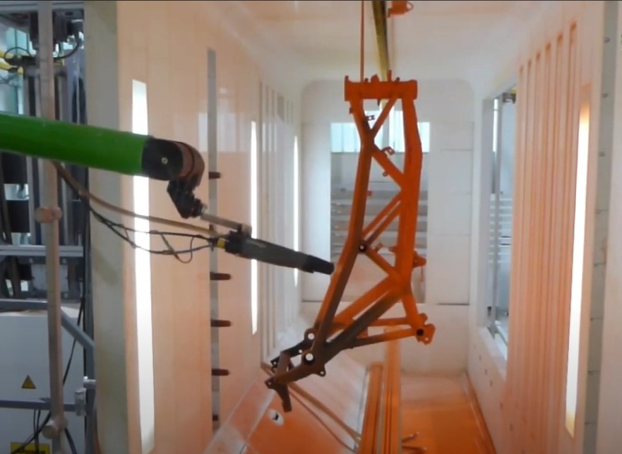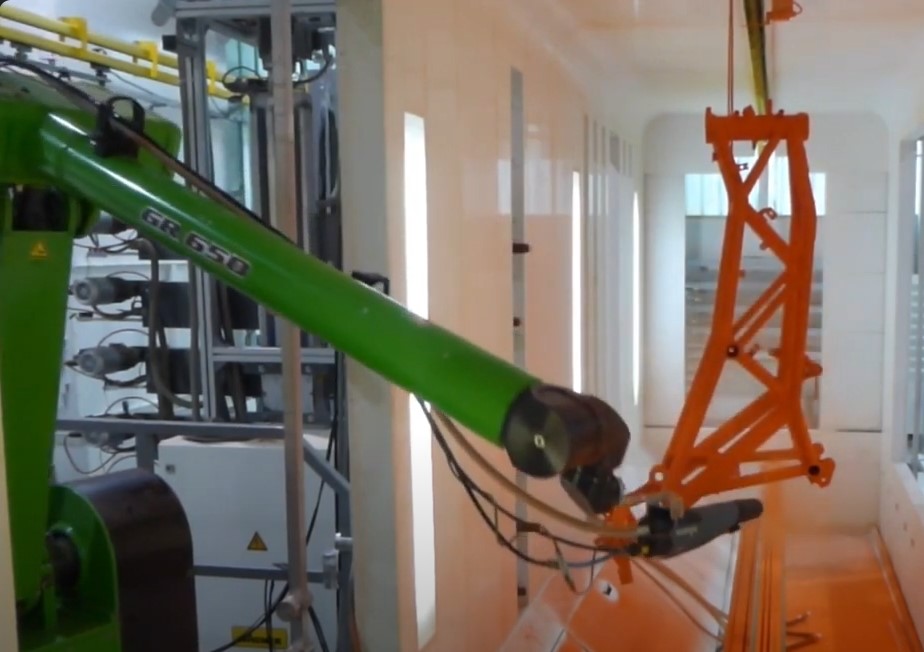 Thanks to the VR Tracking feature, the joystick with the integrated powder coating gun creates the painting program by adjusting the powder gun’s flow rate along with the axis movements and sends it to the paint robot.